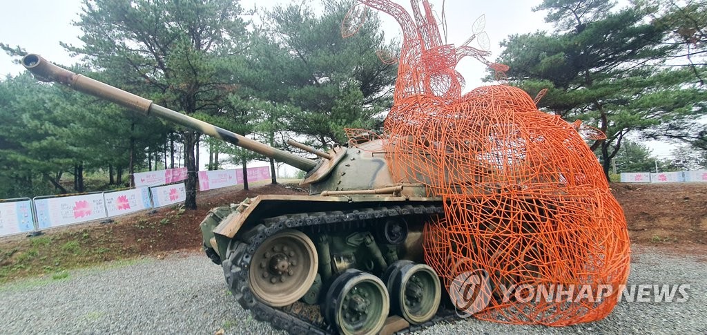 | ▲ 예술작품 된 탱크 (홍천=연합뉴스) 이상학 기자 = 국내 첫 노마딕 시각예술축제인 '강원국제트리엔날레 2021'의 오픈을 하루 앞둔 29일 전시를 위한 모든 준비가 마무리됐다. 사진은 4곳의 전시장 중 한 곳인 홍천 탄약공장 내 설치된 작품 모습이다. 2021.9.29 hak@yna.co.kr |