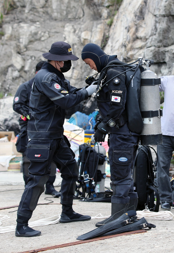 A diver prepares to enter the water at a quay on Wando Island, South Jeolla Province, southwestern South Korea, on June 27, 2022, as police search for a female elementary student and her parents who disappeared mysteriously from a guesthouse there about a month ago. (Yonhap)