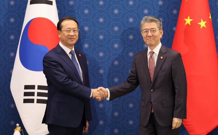South Korea's First Vice Foreign Minister Kim Hong-kyun (R) poses with his Chinese counterpart, Ma Zhaoxu, prior to their strategic dialogue at the foreign ministry in Seoul on July 24, 2024. (Yonhap)