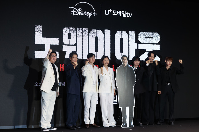The stars of the new Disney+ original series "No Way Out: The Roulette" -- Jo Jin-woong, Yoo Jae-myung, Kim Moo-yeol, Yeom Jung-ah, Sung Yoo-bin, Lee Kwang-soo and Kim Sung-chul (L to R) -- pose for a photo during a publicity event in Seoul on July 24, 2024. The first episode of the series will be available on July 31. (Yonhap)