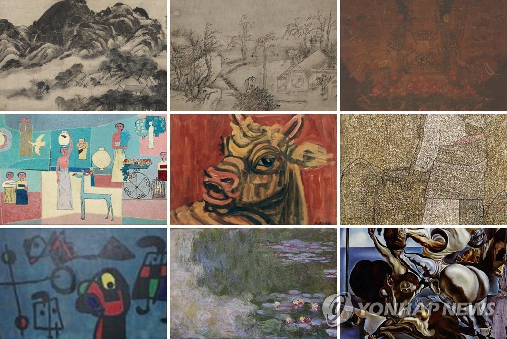 ▲ '이건희 컬렉션' 공개…최고 가치 미술품 수두룩 (서울=연합뉴스)고(故) 이건희 삼성전자 회장의 유족들이 상속세 납부 시한을 앞두고 공개한 사회공헌 계획에 따라 이건희 회장이 평생 수집한 개인소장 미술품 1만1천여건, 2만3천여점은 국가 박물관 등에 기증된다. 사진은 기증 작품의 일부. 윗줄 왼쪽부터 국립중앙박물관에 기증되는 겸재 정선의 '인왕제색도(국보 216호), 단원 김홍도의 '추성부도'(보물 1393호), 고려 불화 천수관음 보살도(보물 2015호). 가운뎃줄 왼쪽부터 국립현대미술관에 기증되는 국내 작품인 김환기의 '여인들과 항아리', 이중섭의 '황소', 박수근의 '절구질하는 여인'. 아랫줄 왼쪽부터 국립현대미술관에 기증되는 국외 작품인 호안 미로의 '구성', 모네의 '수련이 있는 연못', 살바도르 달리의 '켄타우로스 가족'. 2021.4.28 [삼성 제공. 재판매 및 DB 금지] utzza@yna.co.kr