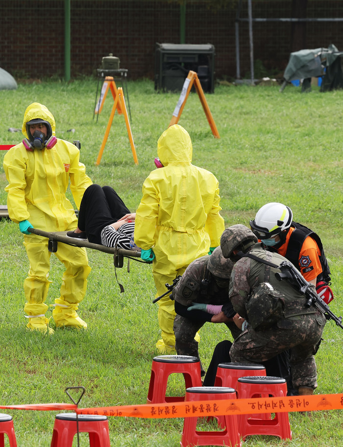Police, firefighters and soldiers jointly conduct a drill against chemical, biological and radiological threats in Suwon, 30 kilometers south of Seoul, on Aug. 20, 2024, as part of the ongoing Ulchi Freedom Shield, a 10-day South Korea-U.S. joint annual military exercise. (Yonhap)