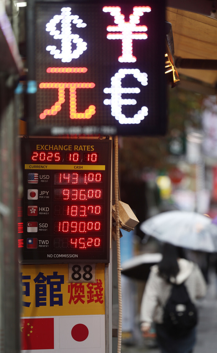 A sign showing the exchange rates of the South Korean won against other currencies informs people that the won is exchanged at 1,431 won per US$1 at a foreign exchange booth in Myeongdong, a shopping mecca in Seoul, on Oct. 10, 2025. The U.S. currency, when changed hands with the won, gained 21 won from the previous day to rise above 1,421 won, the highest level against the won since April 30, when it closed at 1,421 won. (Yonhap)
