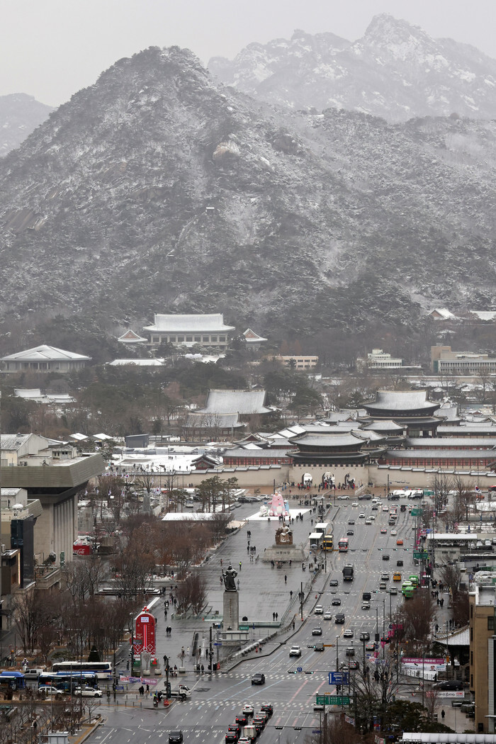 This photo, taken Jan. 27, 2025, shows light traffic on Sejong Boulevard in Seoul, the third day of a six-day break for Seol, or Lunar New Year, which falls on Jan. 29. Seen behind is Gwanghwamun, the main entrance of Gyeongbok Palace, the royal palace during the 1392-1910 Joseon Dynasty. (Yonhap)