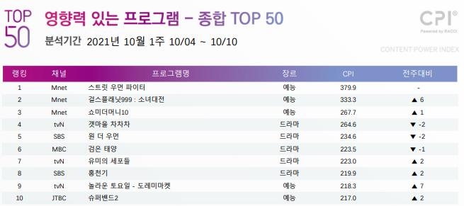 이번 CPI에선 1∼3위를 '걸스플래닛999'을 비롯한 음악·춤 경연 프로그램이 차지한 점도 눈여겨볼 만하다. 여성 댄서들의 화려한 배틀 프로그램인 '스트릿 우먼 파이터'는 지난주에 이어 1위를 지켰고, 국내 최장수 힙합 경연 프로그램 '쇼미더머니10'가 한 단계 올라 3위다.