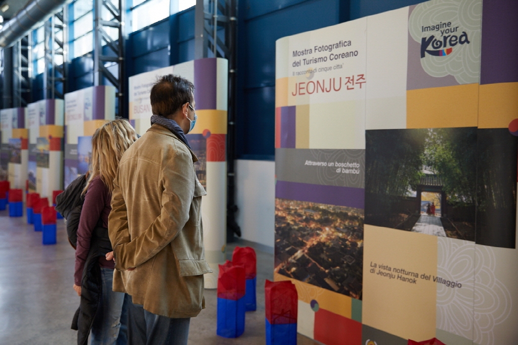 | ▲ 한국은 어떤 곳일까 (밀라노=연합뉴스) 이탈리아인들이 23일(현지시간) 한국주간 행사장에 전시된 한국 주요 도시의 사진을 감상하고 있다. 2021.10.25. [주밀라노 총영사관 제공. 재판매 및 DB 금지] photo@yna.co.kr |
