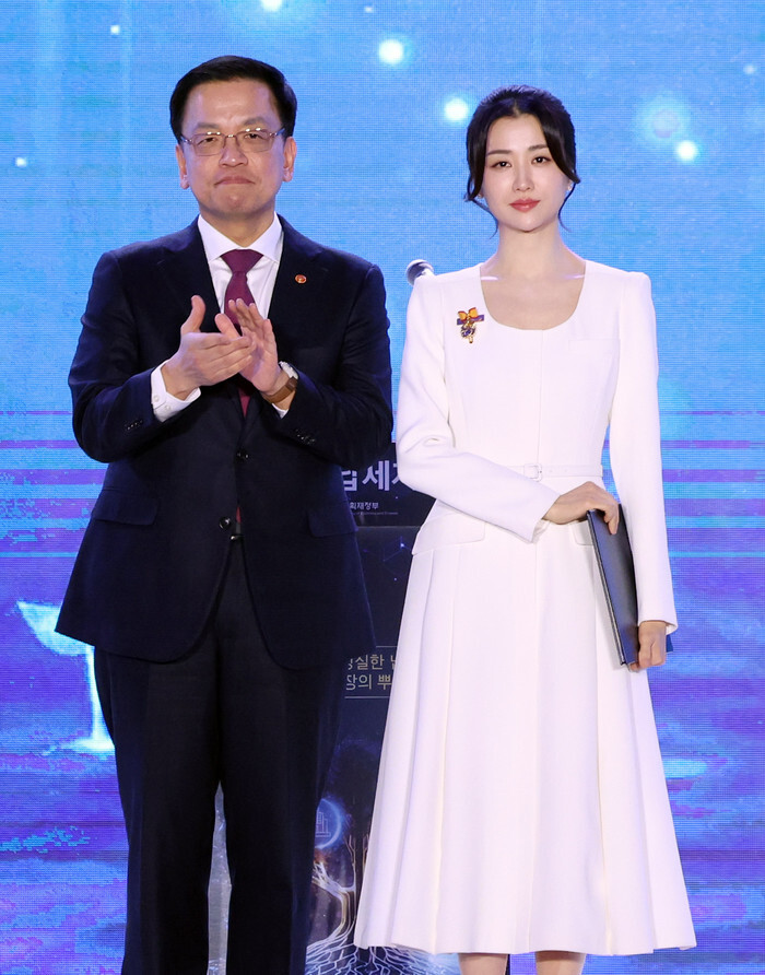 Acting President Choi Sang-mok (L), who concurrently serves as deputy prime minister for economic affairs and finance minister, poses for a photo with actress Park Ha-sun after presenting her with a presidential citation for being an exemplary taxpayer during a ceremony in Seoul on March 4, 2025, to mark the 59th Taxpayers' Day. (Pool photo) (Yonhap)