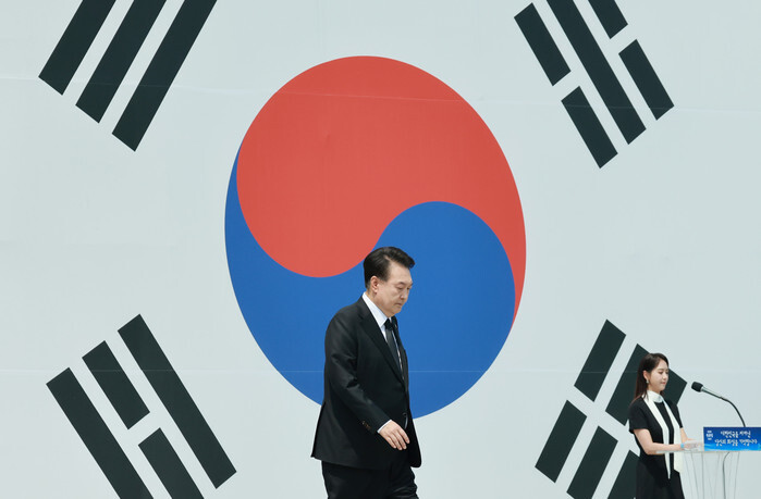 President Yoon Suk Yeol steps down from the stage after delivering a Memorial Day speech at Seoul National Cemetery in Seoul on June 6, 2024. (Yonhap)