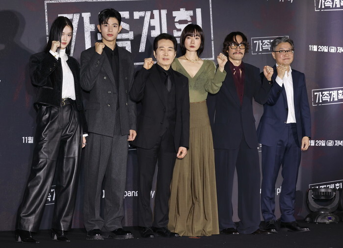 The stars of the "Family Plan" an original series by Coupang Play -- Lee Soo-hyun, Ro Moon, Baek Yoon-sik, Bae Doo-na and Ryu Seung-beom (L to 2nd from R) -- along with director Kim Jung-min (R) -- pose for a photo during a publicity event in Seoul on Nov. 26, 2024. The 6-episode series will be released worldwide on Nov. 29. (Yonhap)