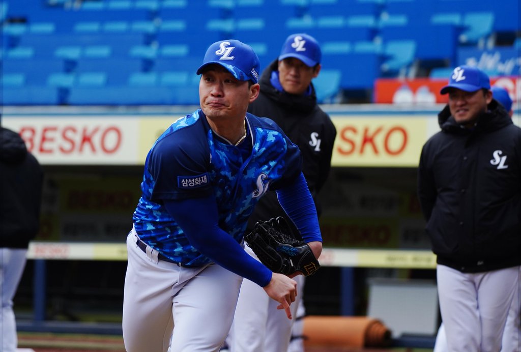 ▲ Oh Seung-hwan of the Samsung Lions warms up before a live batting practice at Daegu Samsung Lions Park in Daegu, 300 kilometers southeast of Seoul, on March 2, 2021, in this photo provided by the Lions. (PHOTO NOT FOR SALE) (Yonhap)