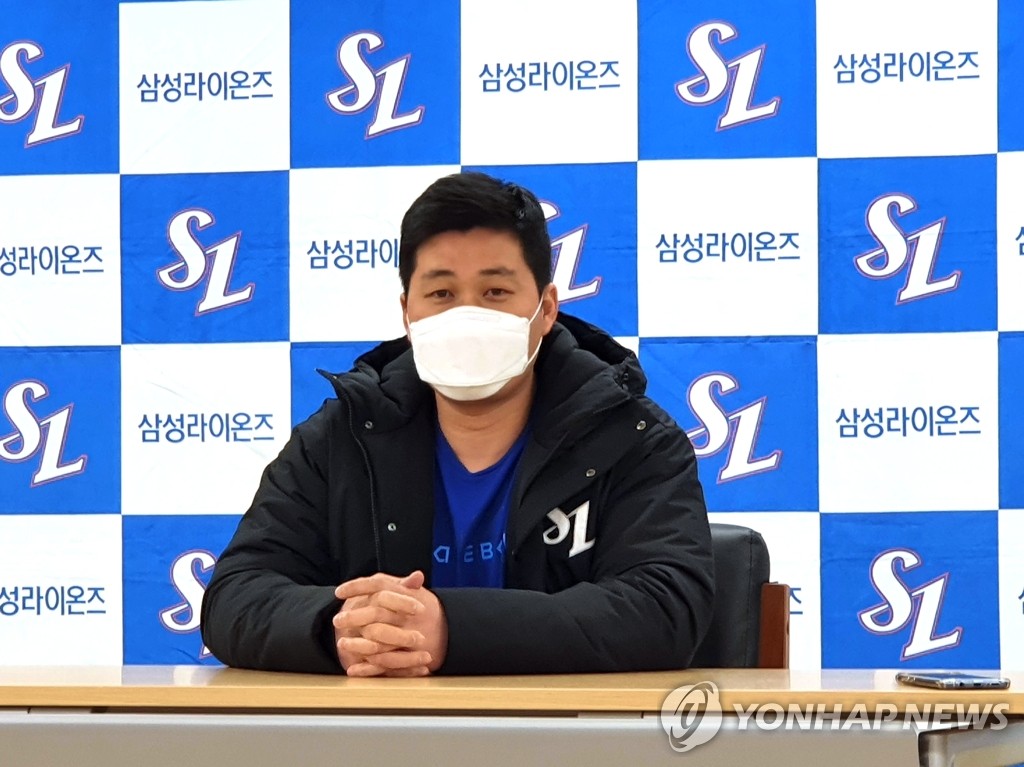 ▲ Oh Seung-hwan of the Samsung Lions speaks to reporters at Daegu Samsung Lions Park in Daegu, 300 kilometers southeast of Seoul, on March 2, 2021. (Yonhap)