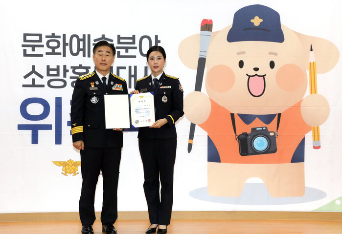 South Korean singer Solbi (R) poses for a photo during a ceremony in Seoul on July 29, 2024, to mark her appointment as a promotional ambassador for the National Fire Agency. (Yonhap)