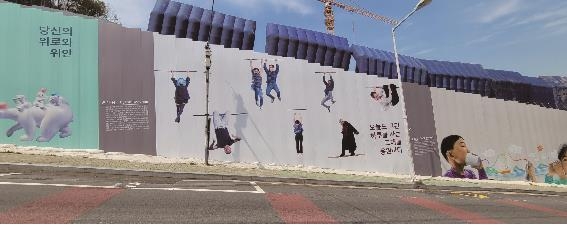 (부산=연합뉴스) 도심에서 흔하게 볼 수 있는 건설공사 현장에 있는 가림막이 예술작품을 전시하는 갤러리로 변신했다.