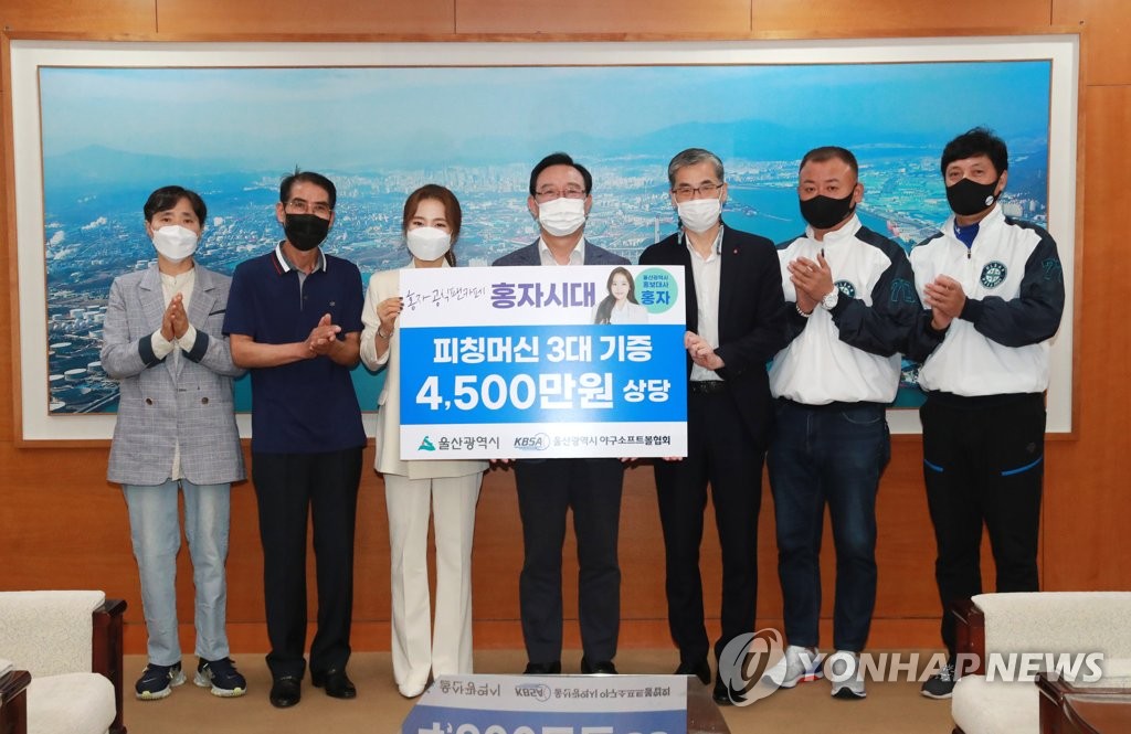 (울산=연합뉴스) 허광무 기자 = 울산시 홍보대사인 트로트 가수 홍자 팬클럽 '홍자시대'는 25일 유소년 야구선수를 위한 피칭머신 3대를 시에 기증했다.