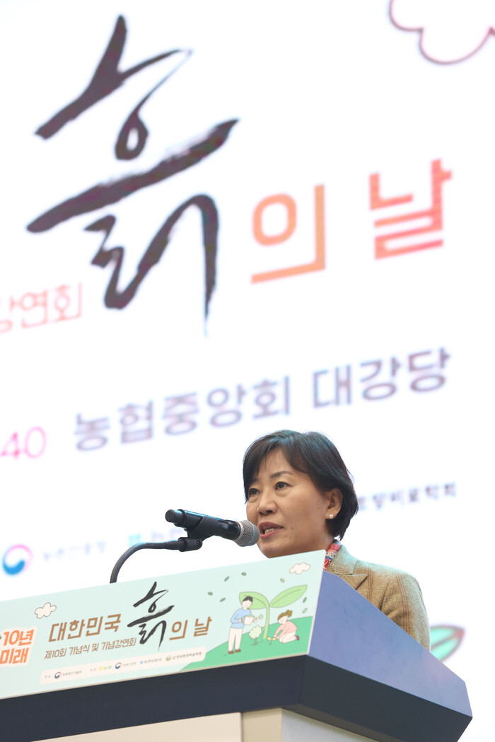 Agriculture Minister Song Mi-ryung speaks during a ceremony at the headquarters of the National Agricultural Cooperative Federation in Seoul on March 11, 2025, Soil Day, which the state-run Rural Development Administration has marked since 2015 as a means to focus attention on the importance of healthy soil and to advocate for the sustainable management of soil resources. (Yonhap)