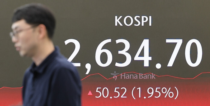 A screen in the dealing room of Hana Bank in Seoul shows the benchmark Korea Composite Stock Price Index having jumped 50.52 points, or 1.95 percent, after a four-day losing streak, closing at 2,634.70 on April 18, 2024, due to bargain hunting. (Yonhap)