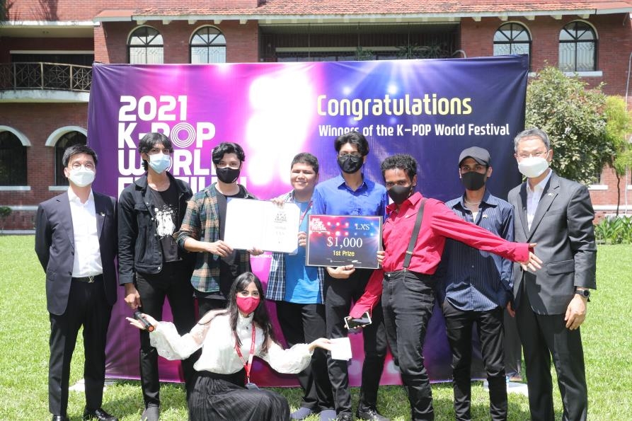| ▲ K-팝 월드 페스티벌 방글라데시 예선 수상팀과 이장근 주방글라데시 대사(맨 오른쪽). 2021.9.16[주방글라데시한국대사관 제공=연합뉴스. 재판매 및 DB 금지] |