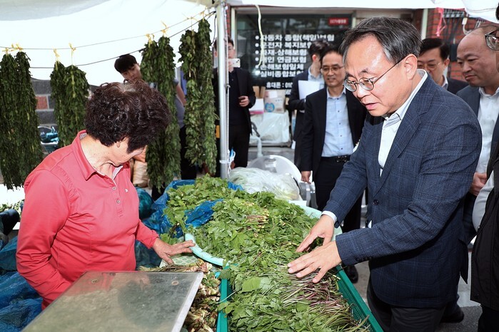 Vice Interior Minister Ko Ki-dong (R) purchases wild greens at a wild greens festival held in the county of Yeongyang, 213 kilometers southeast of Seoul, on May 11, 2024, in this photo provided by the ministry. (PHOTO NOT FOR SALE) (Yonhap)