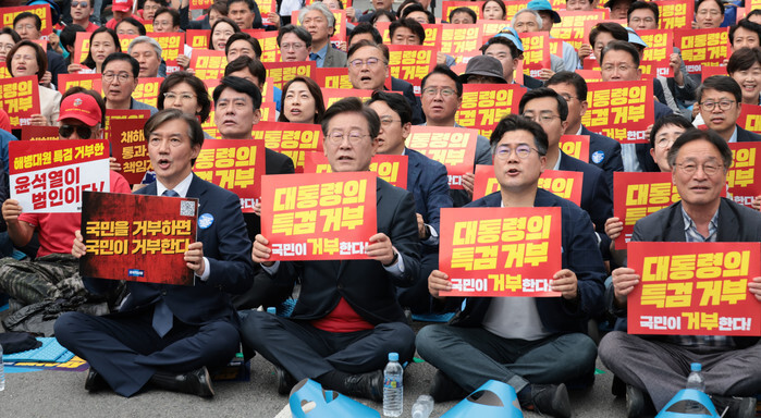 Main opposition Democratic Party leader Lee Jae-myung (2nd from L, front row) and Cho Kuk (L, front row), head of the minor opposition Rebuilding Korea Party, hold placards calling for the passage of a bill mandating a special counsel probe into the military's response to a Marine's death in July 2023, outside Seoul Station in central Seoul on May 25, 2024. (Yonhap)