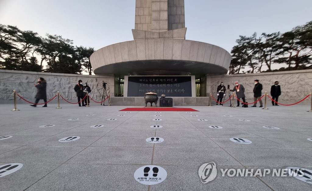 | ▲ Social distancing signs are marked in front of Seoul National Cemetery on Jan. 1, 2021. (Yonhap) |