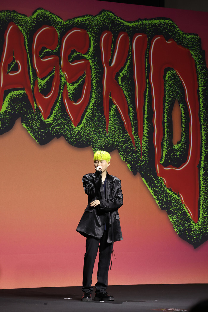 Rapper Zico introduces his new mini album, "Grown Ass Kid," during a showcase at a Seoul hotel on Aug. 1, 2022. (Yonhap)