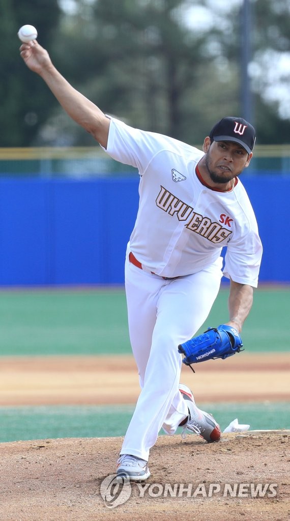 ▲ Wilmer Font of the SK Wyverns throws a pitch in an intrasquad game at Kang Chang-hak Baseball Stadium in Seogwipo, Jeju Island, on March 5, 2021. It was the final scrimmage prior to the Wyverns' name change under the new ownership by Shinsegae Group. (Yonhap)