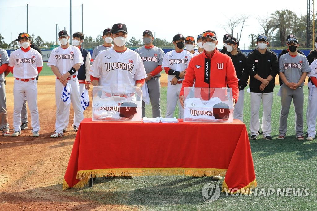 ▲ SK Wyverns' captain Lee Jae-won (L) and manager Kim Won-hyong pose behind their teams' uniform and cap placed in acrylic boxes after an intrasquad game at Kang Chang-hak Baseball Stadium in Seogwipo, Jeju Island, on March 5, 2021. It was the final scrimmage prior to the Wyverns' name change under the new ownership by Shinsegae Group. (Yonhap)