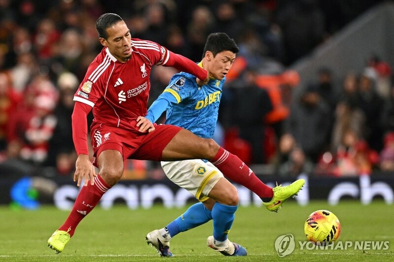 | ▲ 리버풀 수비수 판데이크와 경합하는 황희찬(오른쪽). [AFP=연합뉴스] |