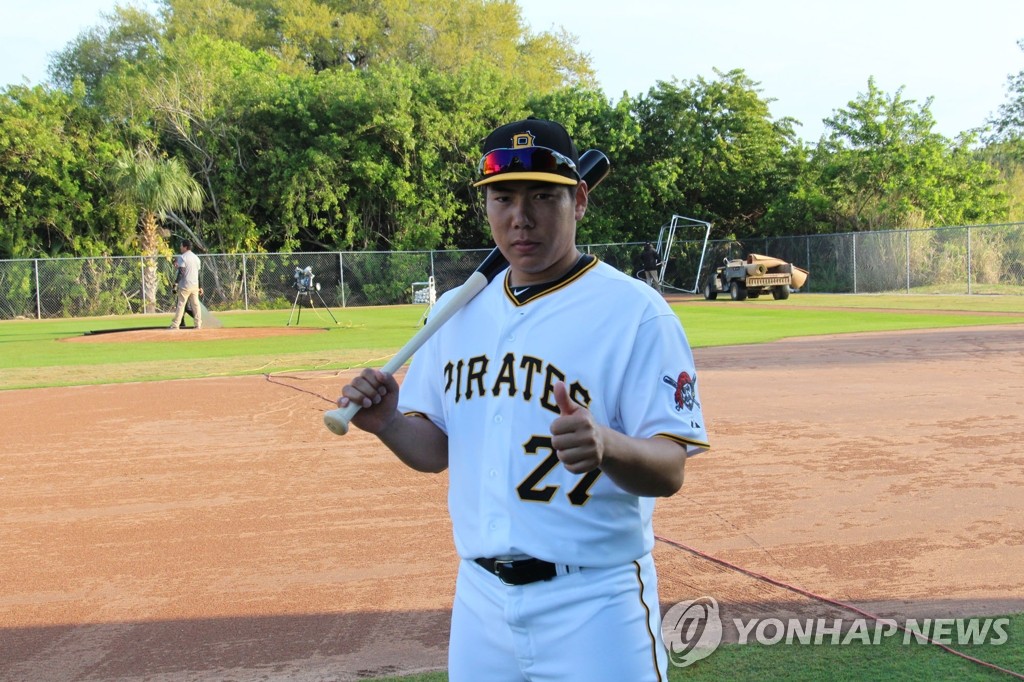 ▲ '해적 27번' 강정호 (브레이든턴<미국 플로리다주>=연합뉴스) 장현구 특파원 = 미국프로야구 피츠버그 파이리츠의 강정호가 26일(현지시간) 스프링캠프인 미국 플로리다주 브레이든턴의 파이리트 시티에서 열린 포토데이 행사에서 포즈를 취하고 있다. 2015.2.27 cany9900@yna.co.kr