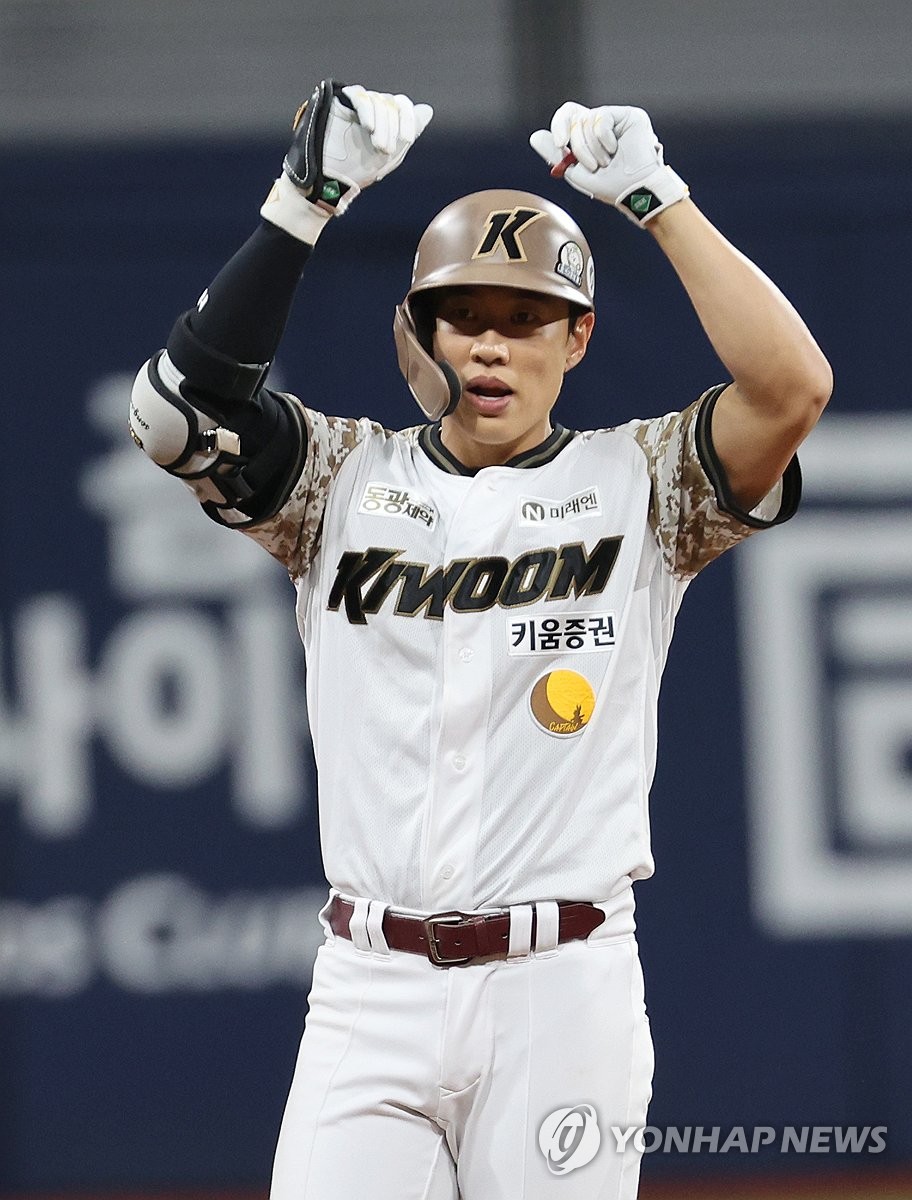 | ▲ 송성문 동점 신고 (서울=연합뉴스) 서명곤 기자 = 26일 서울 고척스카이돔에서 열린 프로야구 2025 신한 SOL 뱅크 KBO리그 KIA 타이거즈와 키움 히어로즈의 경기 3회말 2사 2루, 키움 송성문이 동점 2루타를 친 뒤 기뻐하고 있다. 2025.6.26 seephoto@yna.co.kr |