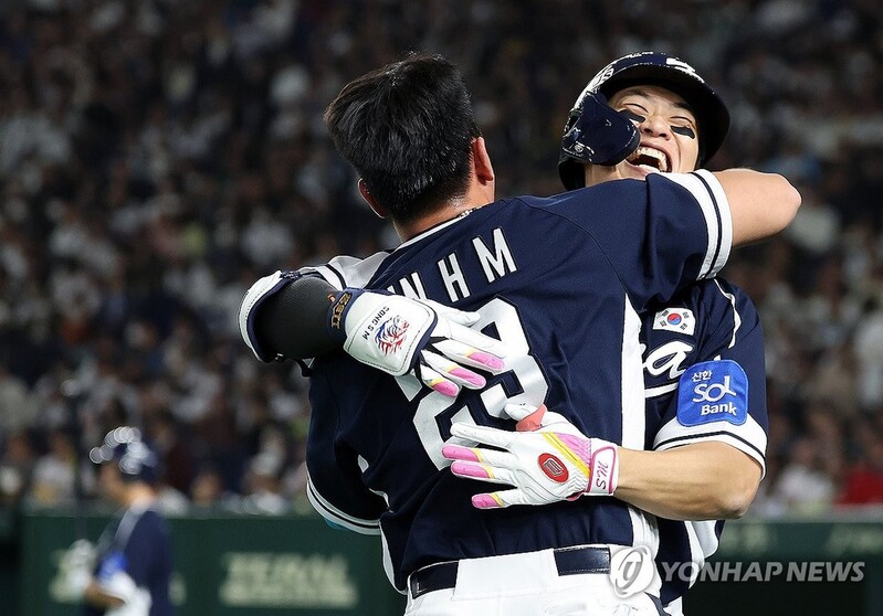 ▲ 포옹 나누는 송성문과 안현민 (도쿄=연합뉴스) 이동해 기자 = 15일 일본 도쿄돔에서 열린 2025 K베이스볼 시리즈 대한민국과 일본의 평가전. 4회초 무사 주자 없는 상황에서 송성문이 솔로홈런을 쏘아올린 뒤 안현민과 기뻐하고 있다. 안현민은 직전 타석 선제 투런홈런을 때렸다. 2025.11.15 eastsea@yna.co.kr