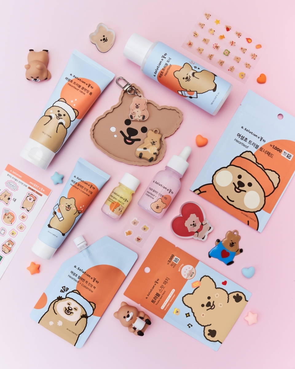 ▲ 애경산업의 브랜드 에이솔루션은 캐릭터 '꽃카'와 협업한 제품을 선보인다. 클렌징폼과 토너, 세럼, 트러블 스팟 패치 등의 제품을 선보인다.