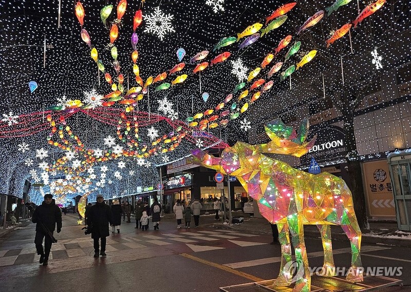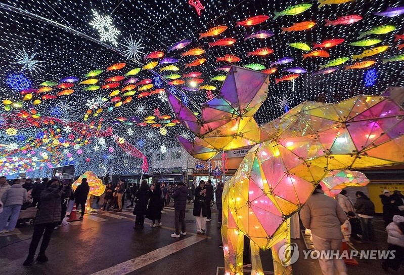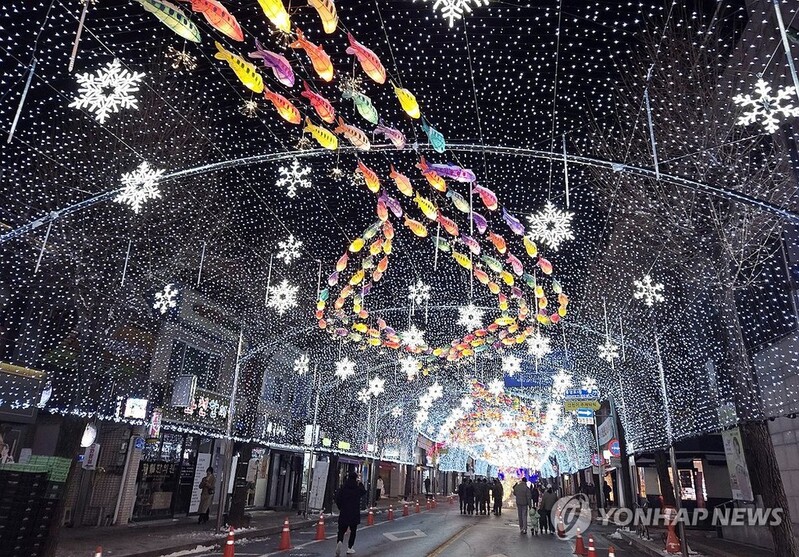 | ▲ 화천산천어축제 시즌 돌입..선등거리 점등 (화천=연합뉴스) 이상학 기자 = 20일 오후 강원 화천군 화천읍 중앙로 일대 선등거리에서 야간에 다양한 조명으로 빛을 밝히는 점등행사가 열렸다. 이 행사는 산천어축제를 앞두고 축제 분위기를 끌어올리기 위해서다. 산천어축제는 내년 1월 10일 개막한다. 2025.12.20 hak@yna.co.kr |