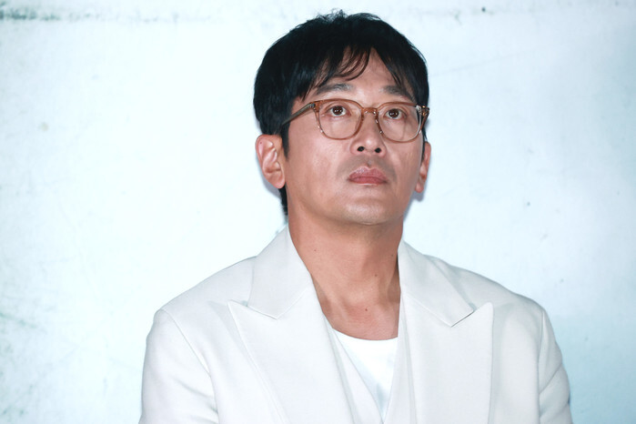 South Korean actor Ha Jung-woo, who stars in the new movie "Hijack," listens to reporters' questions during a publicity event in Seoul on June 13, 2024, to promote the movie that is set to hit local screens in South Korea on June 21. (Yonhap)