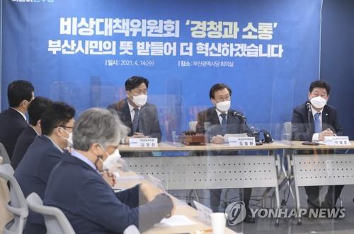 | ▲ Rep. Do Jong-hwan (2nd from R), the head of the ruling Democratic Party's emergency response committee, speaks during a local party meeting held in the southeastern port city of Busan on April 14, 2021. (Yonhap) |