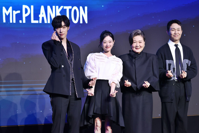 The stars fo the new Netflix original series "Mr. Plankton" -- Woo Do-hwan, Lee Yoo-mi, Kim Hae-sook and Oh Jung-sae (L to R) -- pose for a photo during a publicity event in Seoul on Nov. 4, 2024. The 10-episode series will be released worldwide on Nov. 8. (Yonhap)