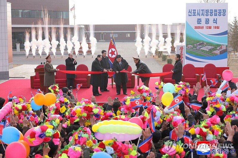 | ▲ North Korean leader Kim Jong-un (C) cuts the ribbon at the inauguration ceremony for regional factories in the eastern coastal city of Sinpho on Dec. 19, 2025, in this photo published by the Korean Central News Agency on Dec. 21, 2025. (For Use Only in the Republic of Korea. No Redistribution) (Yonhap) |