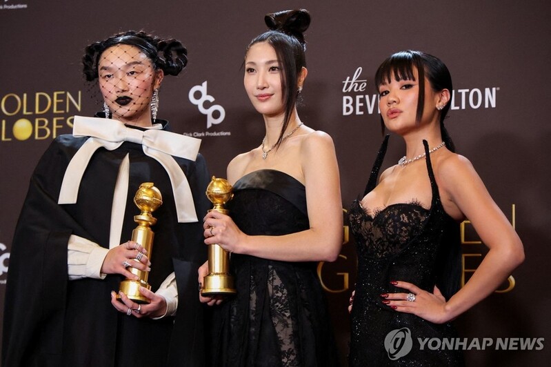 (서울=연합뉴스) 정래원 기자 = 넷플릭스 애니메이션 영화 '케이팝 데몬 헌터스'(이하 '케데헌')가 미국 골든글로브 시상식 2관왕에 오르며 한국계 캐나다인 매기 강 감독과 주제가 '골든' (Golden)의 한국인 작곡가들이 잇달아 무대에 올랐다.