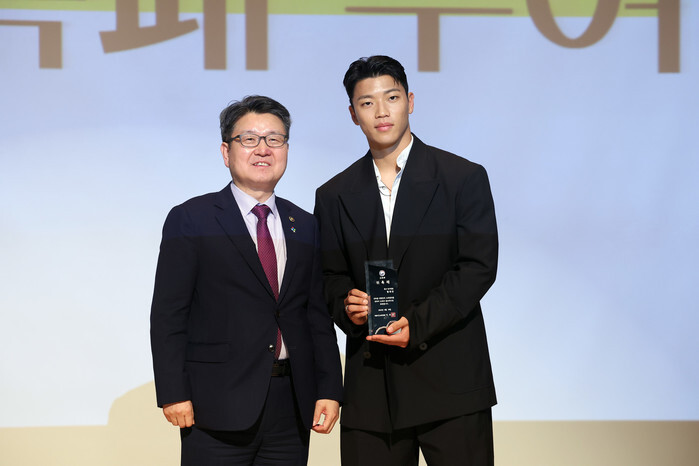 Hwang Hee-chan (R) of the EPL's Wolverhampton Wanderers poses for a photo with Vice Education Minister Oh Seok-hwan after being appointed as the ministry's promotional ambassador at the government complex in Sejong, 112 kilometers south of Seoul, on June 18, 2024. (Yonhap)