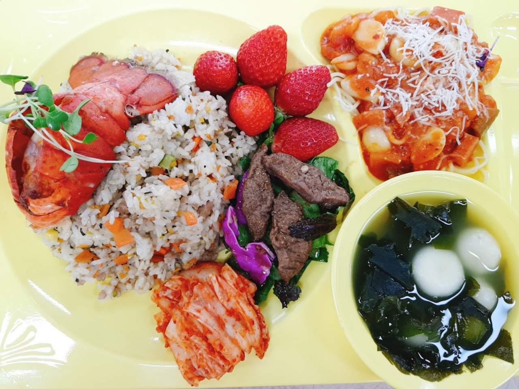 이날 점심에는 한 마리를 통째로 오븐에 구운 랍스터 치즈 버터구이를 비롯해 떡갈비 철판 볶음밥, 로제 크림 스파게티, 샐러드, 미역국, 딸기 등이 나왔다.