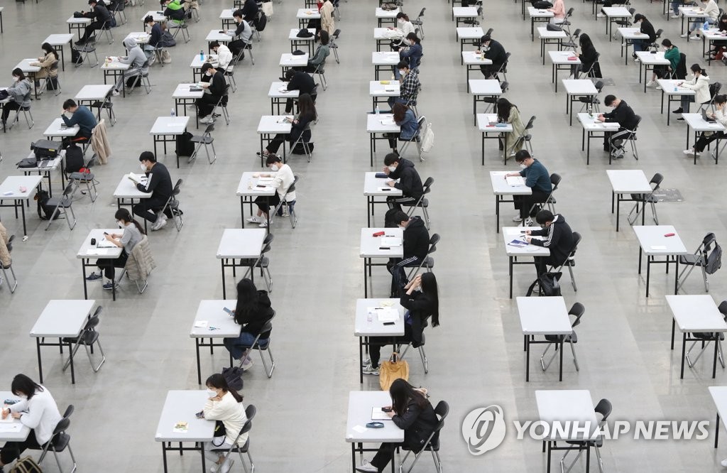 ▲ Applicants for jobs at the Daegu Metropolitan Transit Corporation take an exam in Daegu, about 300 kilometers southeast of Seoul, on May 2, 2021, while keeping distance from each other amid COVID-19 pandemic. (Yonhap)