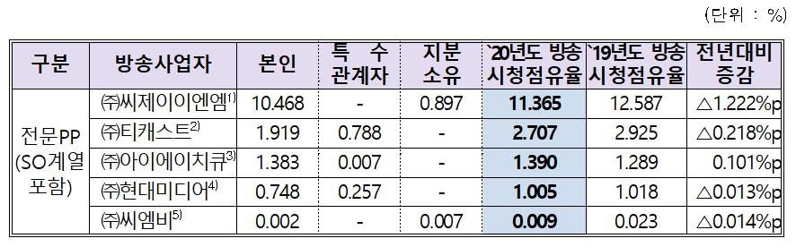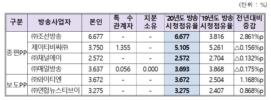 주요 사업자별 합산 시청점유율은 CJ ENM 11.368%, TV조선 11.135%, JTBC 7.727%, 채널A 5.157%, MBN 4.814%였다. 일간신문 구독률이 산정되지 않는 방송사는 방송시청 점유율과 합산 시청점유율이 같다.