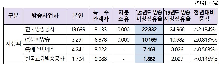 모든 지상파 사업자와 TV조선을 제외한 모든 종편 사업자의 점유율이 하락했다. TV조선은 지난해 3.816%보다 점유율이 대폭 높아졌다. 2개 보도채널도 지난해보다 점유율이 상승했다.