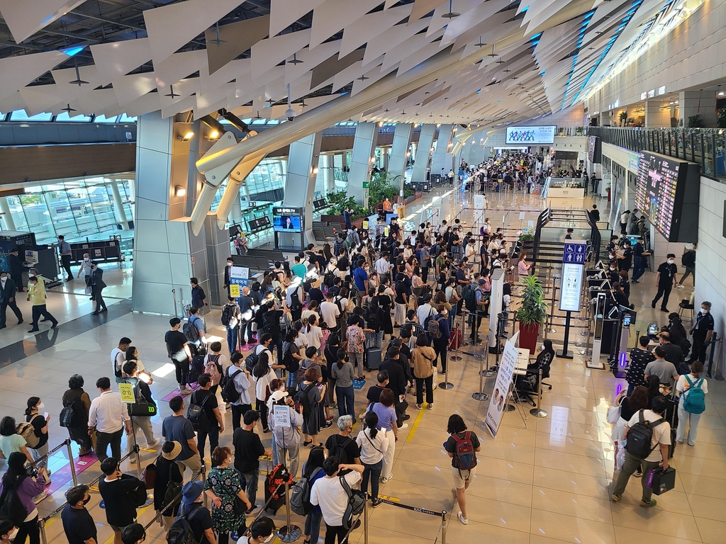 김포공항은 이날 오후 '추캉스'(추석+바캉스)를 떠나는 여행객들로 붐볐다. 오후 3시께 공항 3층 출발장에는 탑승 수속을 기다리는 이들로 장사진을 이뤘다. 검색대로 향하는 출입구 2곳 앞에는 각각 수백명이 굽이굽이 줄을 서 있었다.