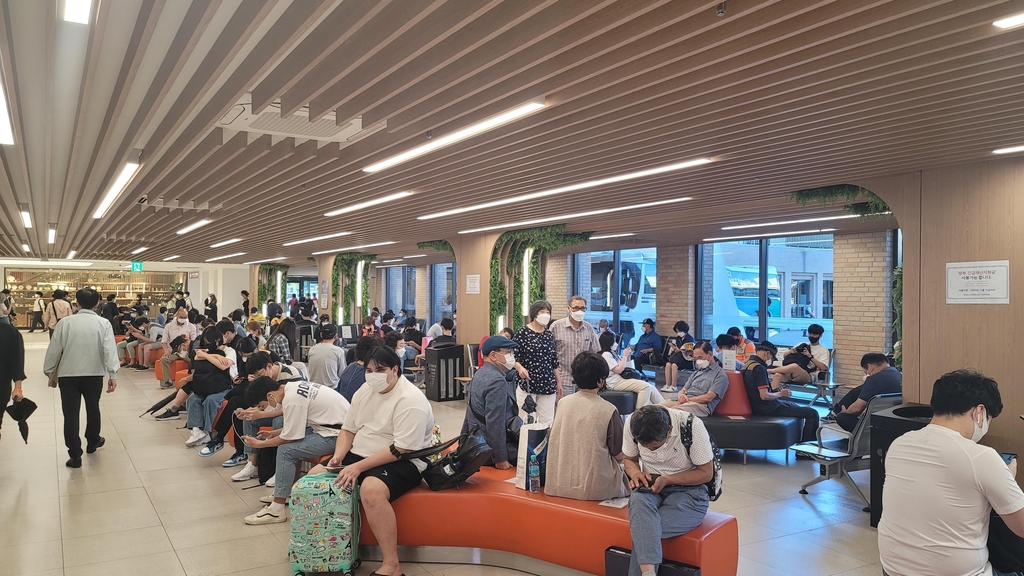 오후 4시께 반포 고속버스터미널 대합실도 붐볐다. 대합실은 캐리어와 짐을 내려놓고 버스를 기다리는 사람들로 가득했고, 일부 귀성객은 선 채로 주변을 두리번거리며 빈 좌석을 찾았다.