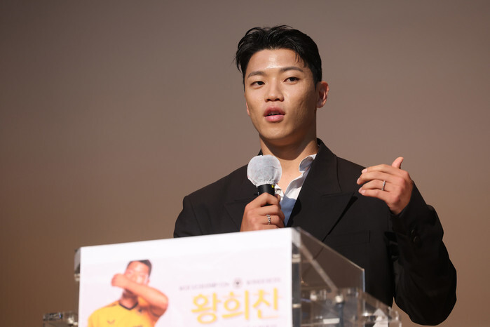 Hwang Hee-chan of the EPL's Wolverhampton Wanderers speaks after being appointed as the education ministry's promotional ambassador at the government complex in Sejong, 112 kilometers south of Seoul, on June 18, 2024. (Yonhap)