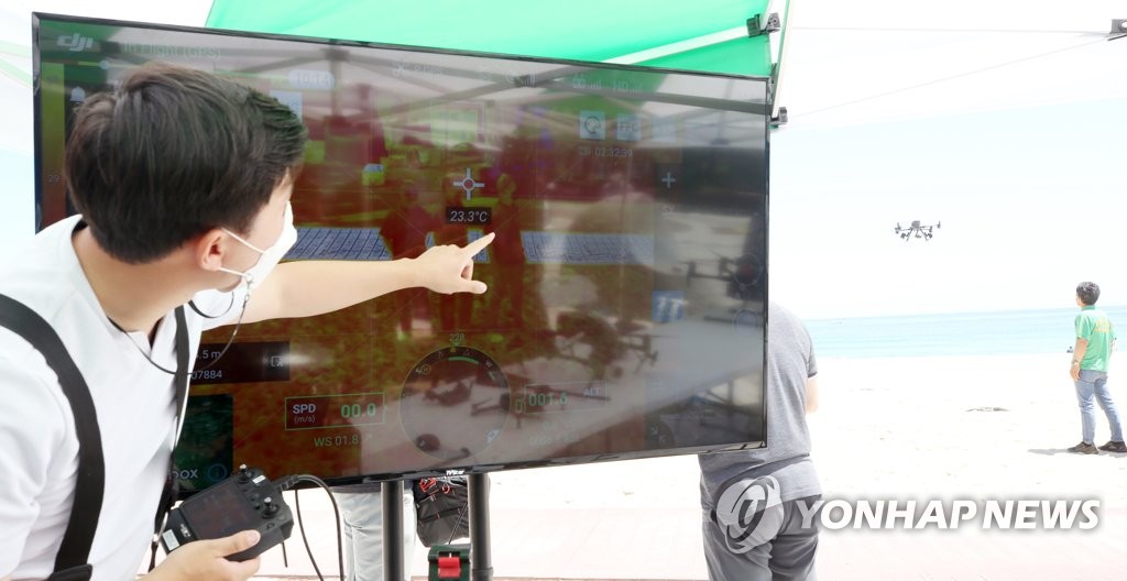 | ▲ 발열 환자 찾아내는 드론 등장 (강릉=연합뉴스) 이해용 기자 = 지난 4일 강원 강릉시가 해수욕장에서 코로나19가 확산하는 것을 막기 위해 열화상 카메라를 부착해 체온이 높은 발열 환자를 확인하는 드론을 경포해변에서 선보이고 있는 모습. [연합뉴스 자료사진] |