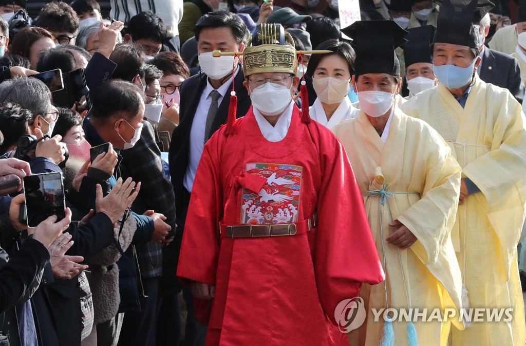 | ▲ Lee Jae-myung (front), the presidential nominee of the ruling Democratic Party, participates in a ritual at the Pyoam Shrine in Gyeongju, 371 kilometers southeast of Seoul, to report to his ancestors his intention to run in the March 9 presidential election. (Yonhap) |