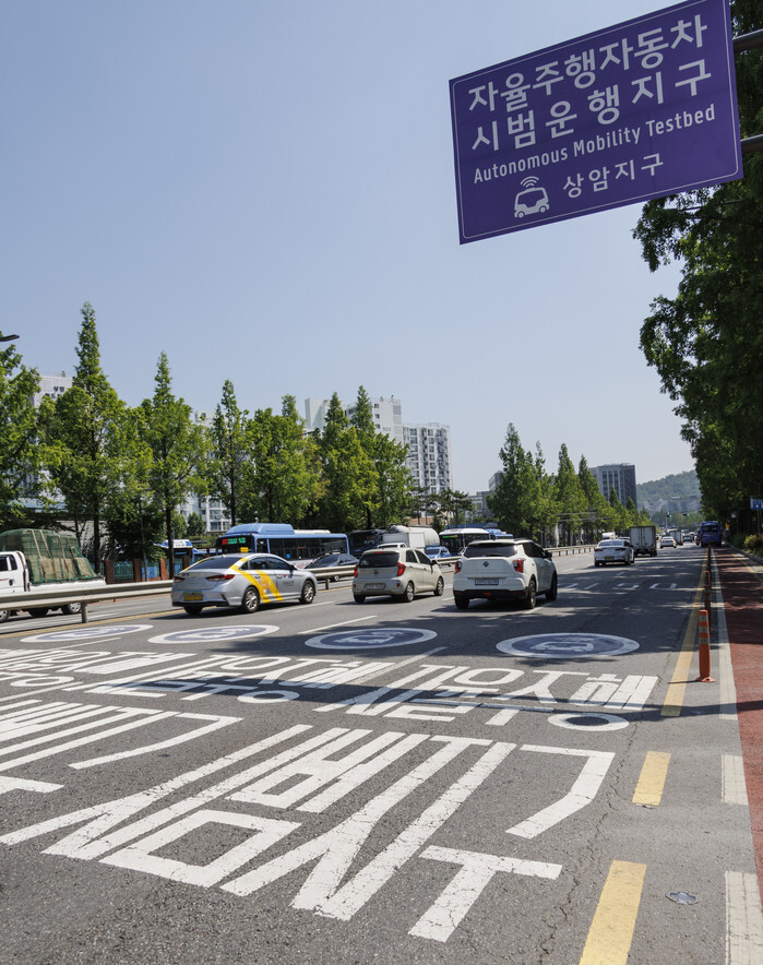 Seen here is a special zone for the operation of a self-driving car in Seoul's Sangam district, temporarily approved by the land and transport ministry on June 13, 2024. The operation is set to be conducted with a driver in the car for emergencies over the next four months and without a driver starting in October. (Yonhap)