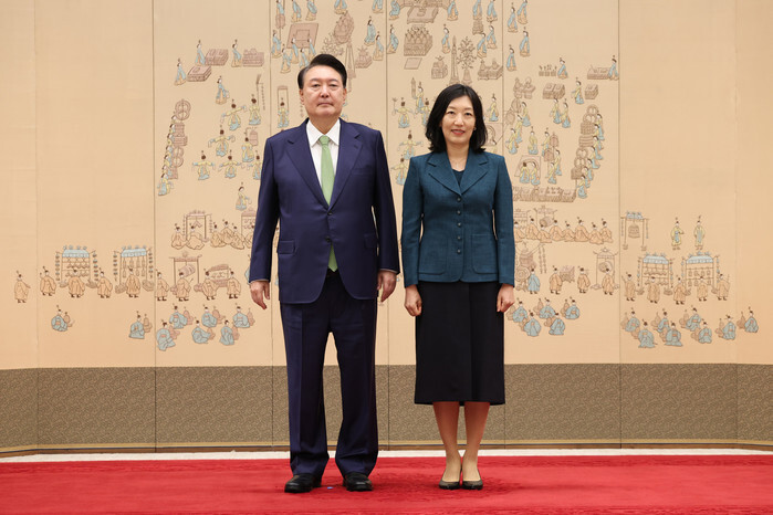 President Yoon Suk Yeol (L) poses with Ahn Eun-ju after presenting her his credentials as the new South Korean ambassador to Tanzania at the presidential office in Seoul on Aug. 20, 2024. (Yonhap)